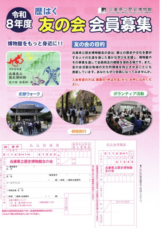兵庫県立歴史博物館 友の会 会員募集中! 2026/04/01 taniguchi 「兵庫県立歴史博物館友の会」の新年度会員募集中です。さまざまな企画や特典がございますので、入会して史に触れてみられてはいかがでしょうか。